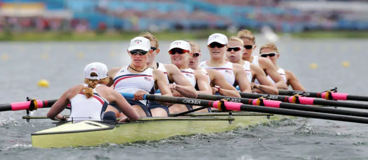 Eight-oared rowing shell carries how many people total?